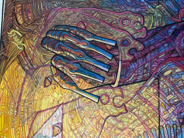 Impresionante la obra del Maestro Carlos Terrés que esta en exhibición en los muros de “Terréscalli” (la Casa de Terrés, náhuatl) donde se puede apreciar el punto de vista actual de este pintor, que como un cronista relata la pandemia que estamos padeciendo en México y en el resto del mundo.