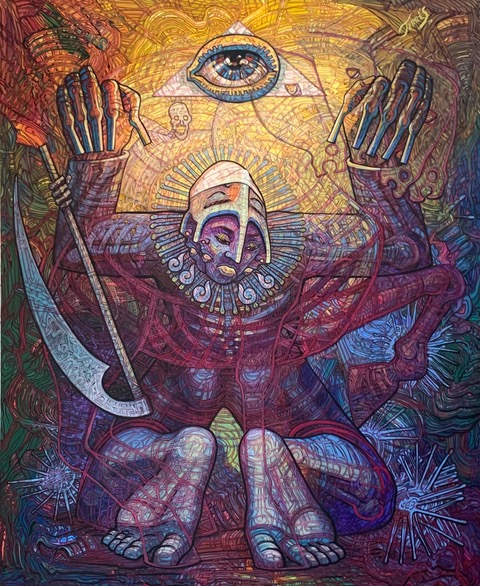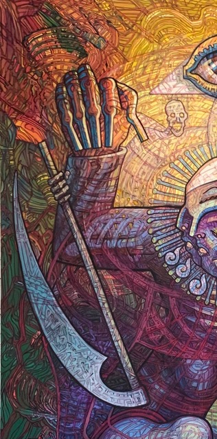 La cabeza de la figura se convierte en un hombre pentafácico, que comprende los cinco continentes, asfixiados por el coronavirus que ahoga las voces que se desprenden de las bocas contagiadas, el hombre con la boca tapada es atacado por los cuatro jinetes apocalípticos donde destaca el caballo del color del cadaver, el amarillo de la peste, cabalgado por la muerte que lleva su guadaña.