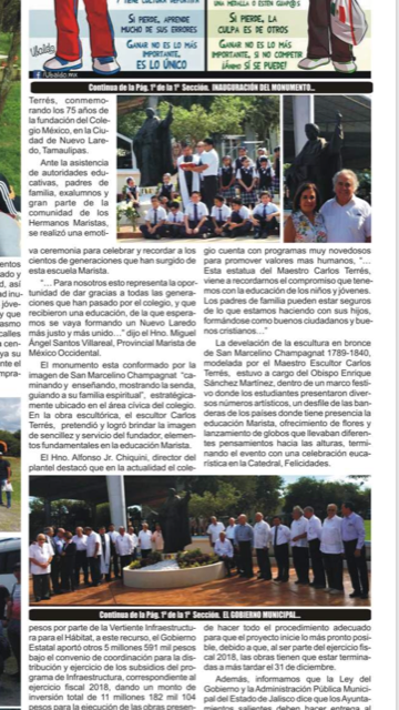 El pasado miercoles 21 de septiembre del 2018, se develó la escultura en bronce de San Marcelino Champagnat 1789-1840 modelada por el Maestro Escultor Carlos Terrés, conmemorando los 75 años de la fundación del Colegio México, en la Ciudad de Nuevo laredo Tamaulipas.